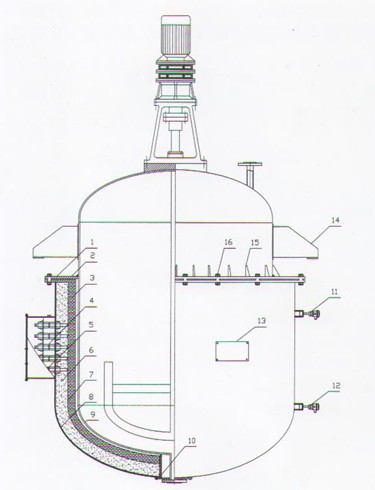 1、固定法蘭2、連接法蘭3、遠紅外輻射加熱區4、接線柱5、接線盒6、硅酸鋁保溫層7、絕緣云母板8、加熱器金屬外殼9、用戶反應釜膽10、防爆密封件11、遠紅外上段測溫探頭12、遠紅外下段測溫探頭13、銘牌14、反應釜支耳15、三角形加強板16、法蘭連接螺栓