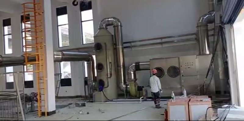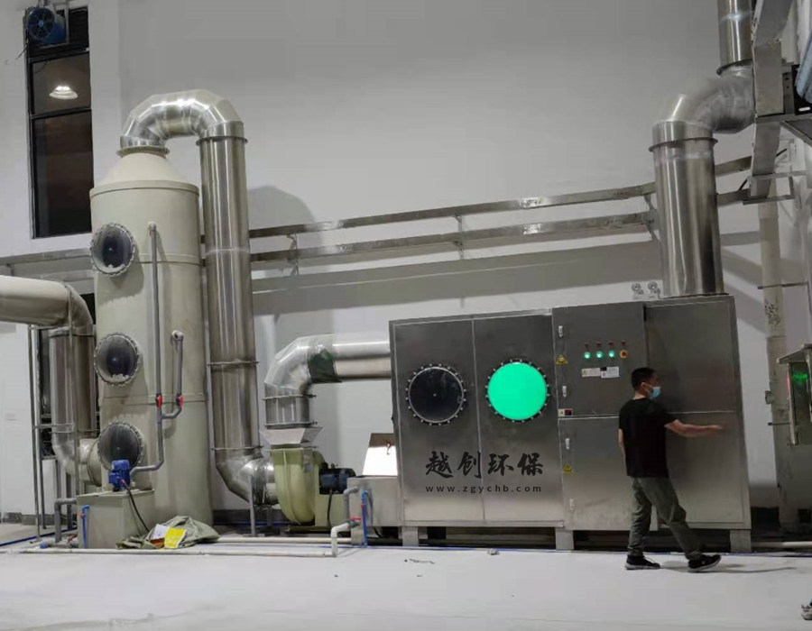 在室內(nèi)安裝集氣罩、風(fēng)管、臭氣在動(dòng)力系統(tǒng)抽風(fēng)機(jī)的作用下,經(jīng)抽風(fēng)口送入后端的高效一體化噴淋除臭設(shè)備;廢氣首先通過噴淋段將溶于水的惡臭物質(zhì)吸收,再通過脫水區(qū)將顆粒狀態(tài)的水霧攔截為后續(xù)處理創(chuàng)造條件;經(jīng)脫水后的廢氣經(jīng)過紫外線燈管殺菌區(qū)對廢氣內(nèi)漂浮的致病細(xì)菌殺滅處理,殺菌后的廢氣經(jīng)過活性氧離子發(fā)生區(qū),將廢氣中的氧分子轉(zhuǎn)化為活性氧離子,通過活性氧離子來氧化分解有機(jī)惡臭物質(zhì),為了加強(qiáng)氧化反應(yīng)效果,在設(shè)備后端設(shè)計(jì)氧化反應(yīng)區(qū),通過多工藝組合的方式,使惡臭物質(zhì)不斷的降解而達(dá)到凈化達(dá)標(biāo)排放目的。
